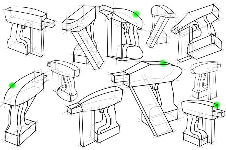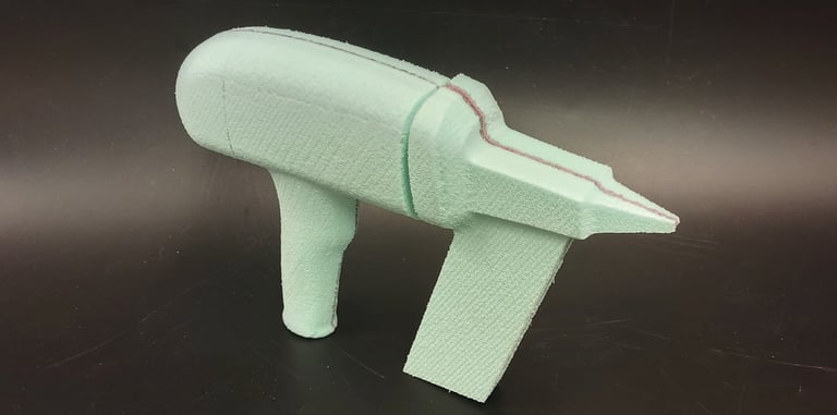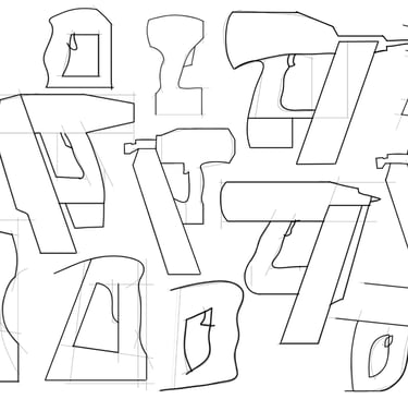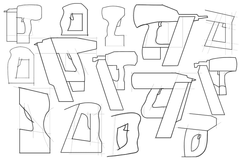 After deciding on a selection of the best sketch directions, I transfered the designs to pink foam core insulation blocks. I cut out each nail gun handle into a rough shape and then sanded them down untill thay could be used comfortably in the hand. Using another piece of foam board, I then attached it to the main handle bodies to test out the different nail clip positions and sizes.