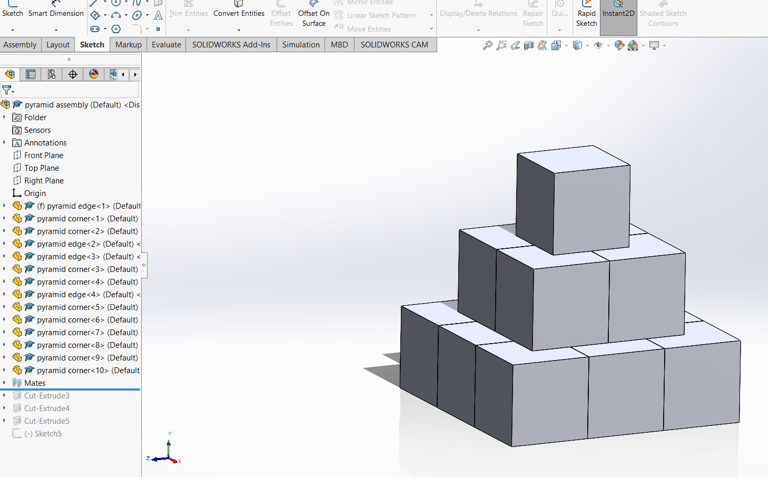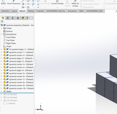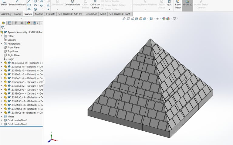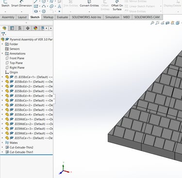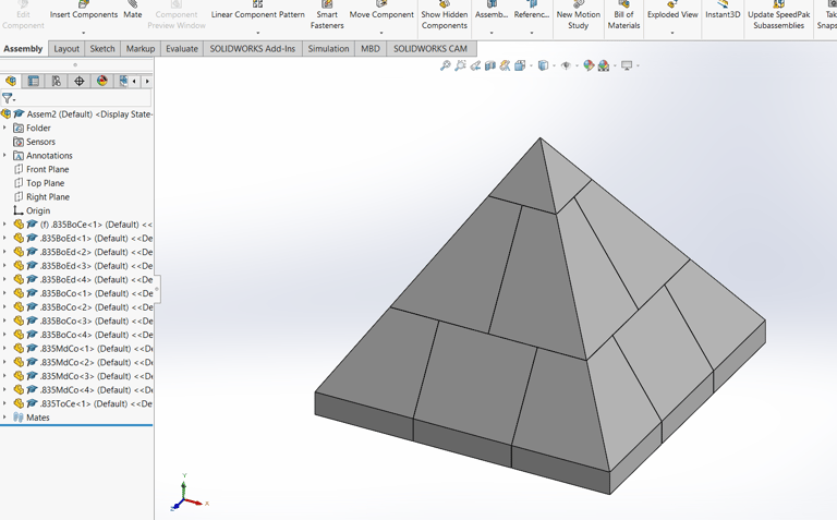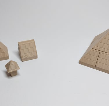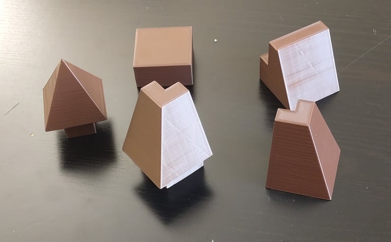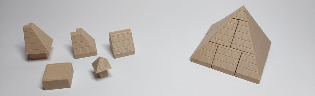 In Pyramid Quest, the main goal in order to win the game is to be the first player to complete their entire pyramid. Each pyramid consists of 14 pieces, all of which were created in Solidworks. Each piece consists of a slight brick pattern shallow enough for the purposes of mass manufacturing through the processes of plastic moldings.