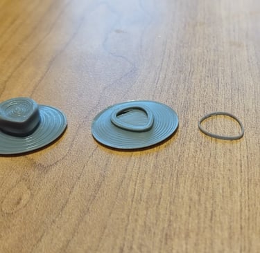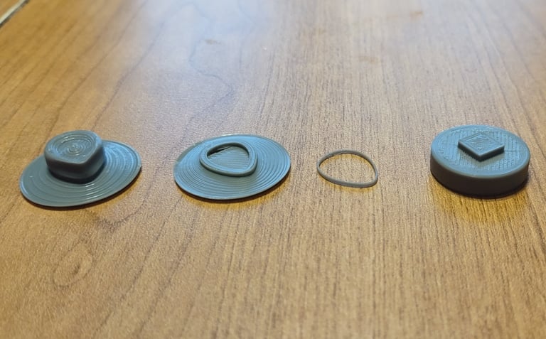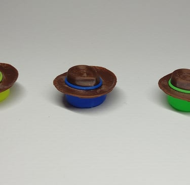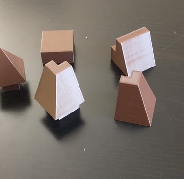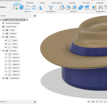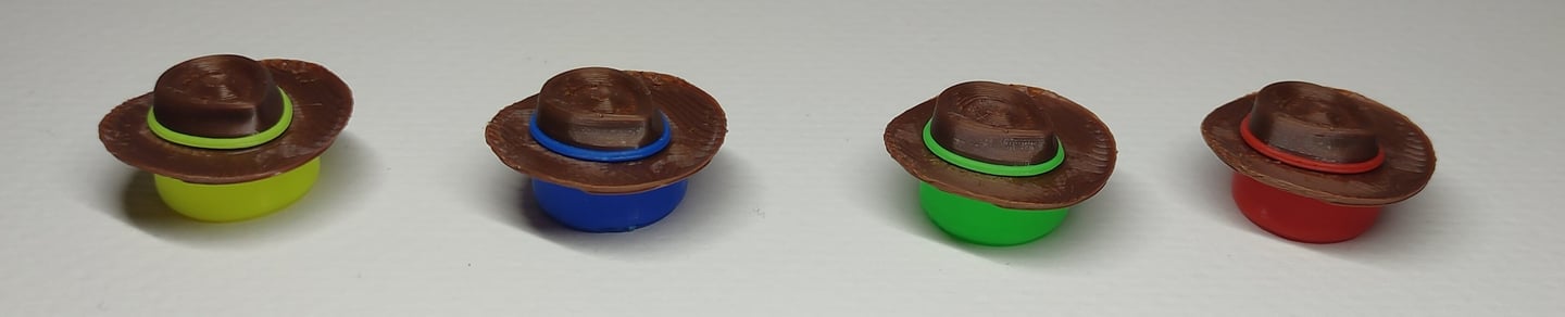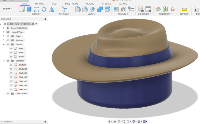 The player icons were each made in Fusion 360 using the t-spline tool. The design for the hat shape was created to better represent each player as being an archeologist. The player pieces were split into three different parts so that they could all be printed independently with their respective colors. After the printing was done, they were then glued together.