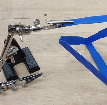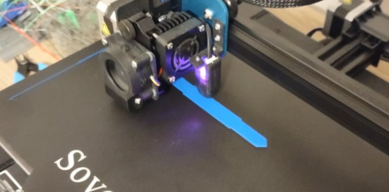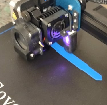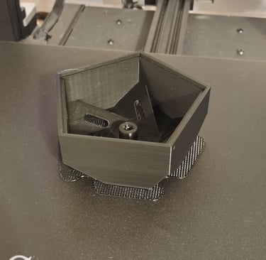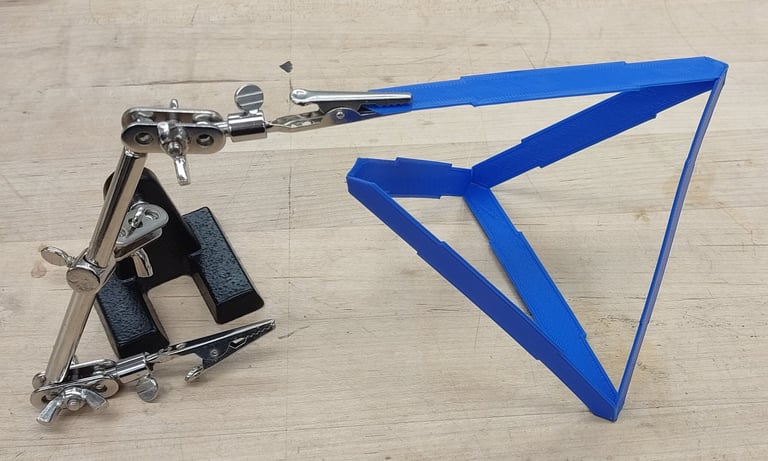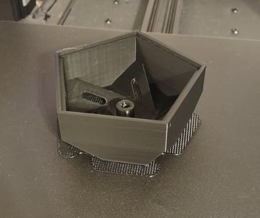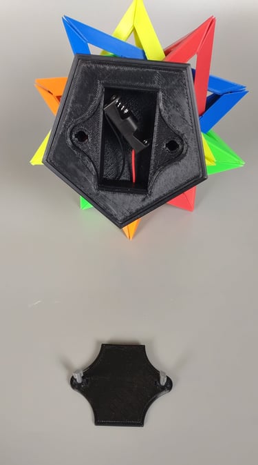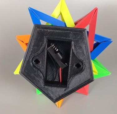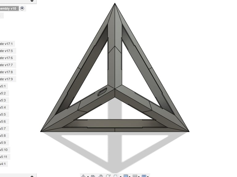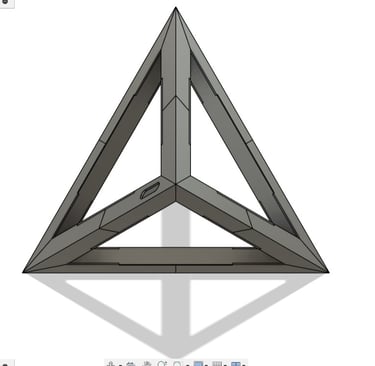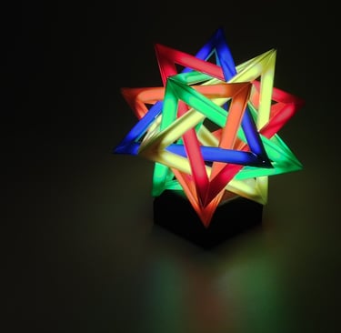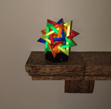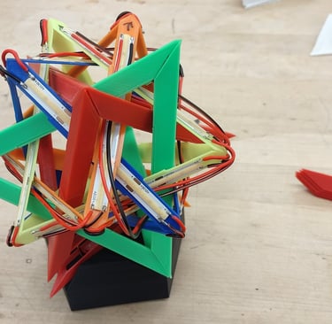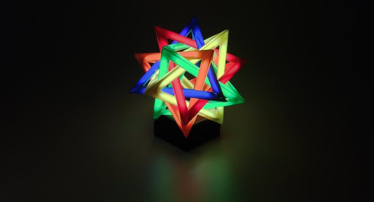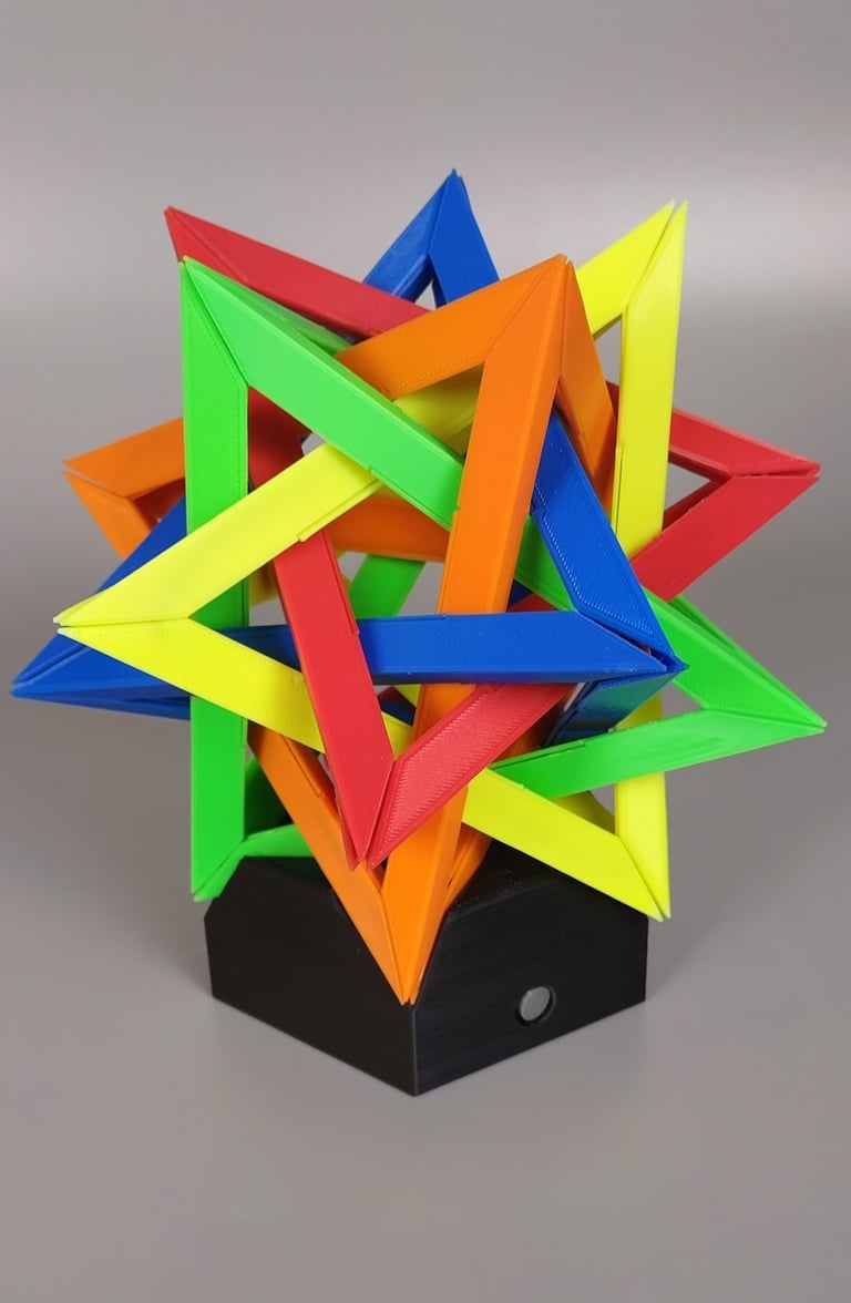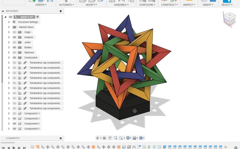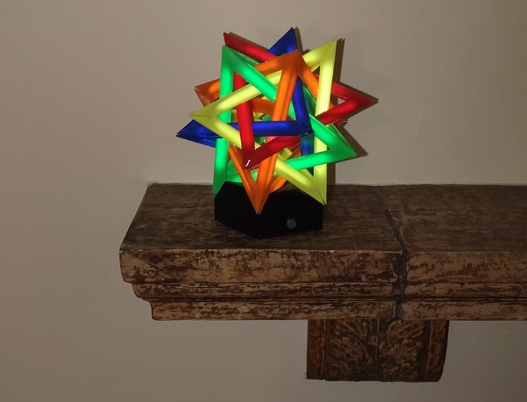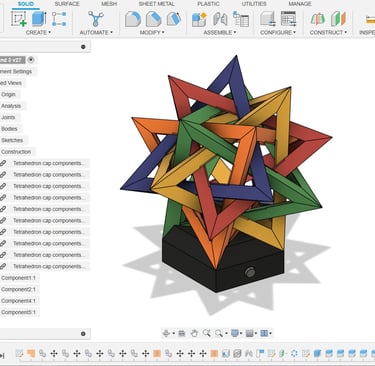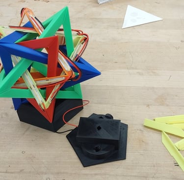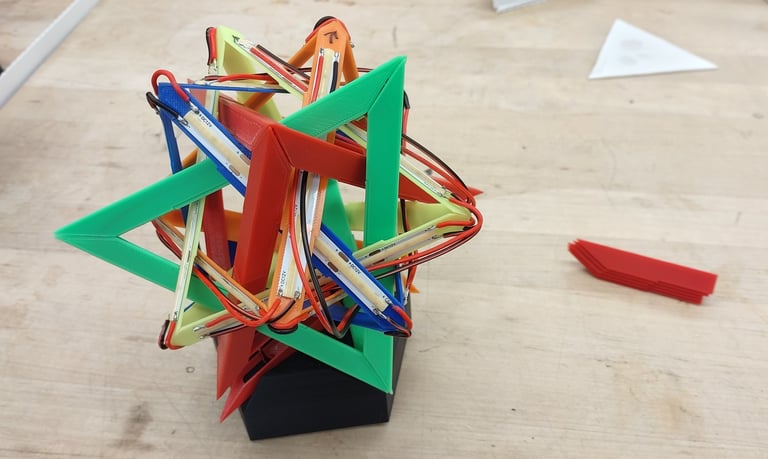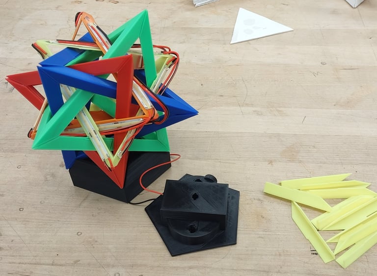 With the CAD model completed, 3D printer production of the different parts began. Outside of the stand for the lamp, the different tetrahedron components were all printed from differently colored filaments.