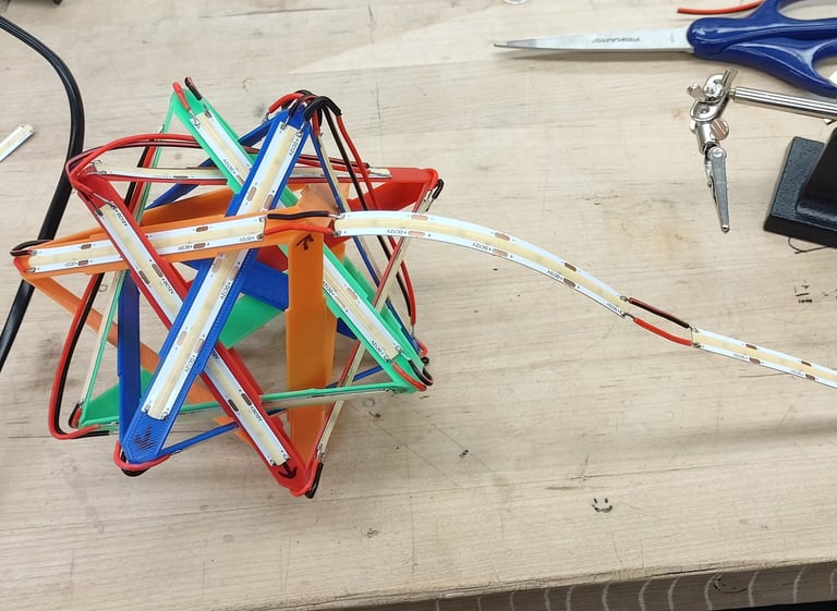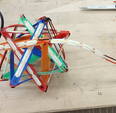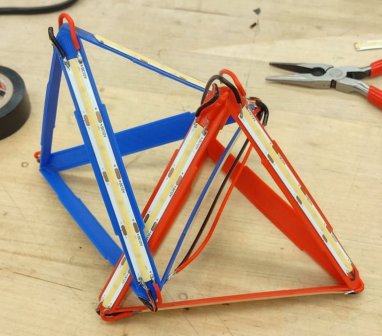 LED light strips are used to create the lamp's light sorce. As the different tetrahedron shapes are glued together, the assemply of the LED strip also took place.