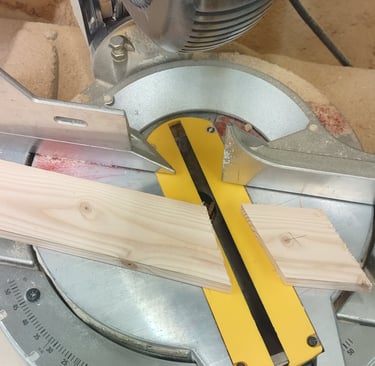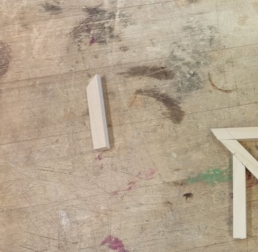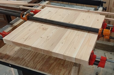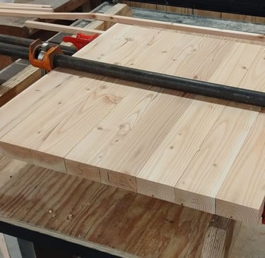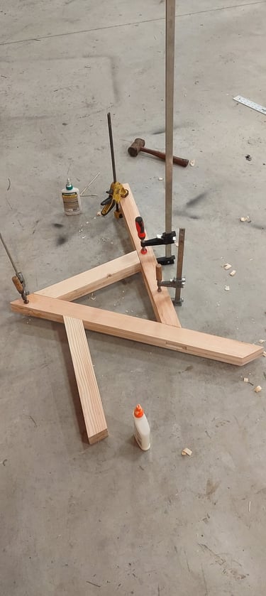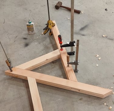 After the scale model was finished, work on the full scale version began. The chair is created from 2 by 4 planks of lumber which is striped and planed into evenly measured panels. Each panel was cut to shape and then attached together using wood glue. Each large portion of the chair was then held together using wood joinery techniques.